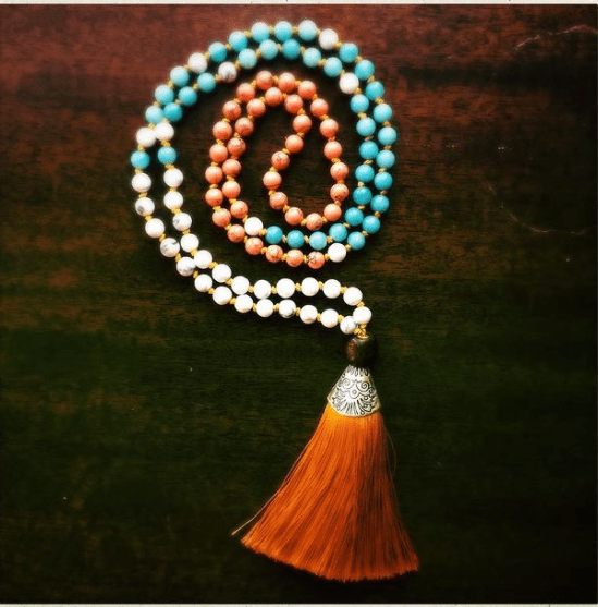 - As a meditation tool: Hold the necklace in your hands. Starting at the guru bead (the large bead at the bottom of the mala) hold it between your thumb and middle finger. Recite a mantra or simply breathe in for a count of 4 and out for a count of 4, moving to the next bead and repeating until you’ve reached the guru bead again.